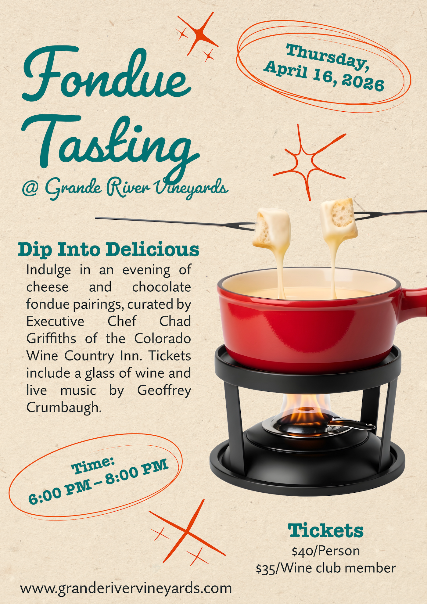 Indulge in an evening of cheese and chocolate fondue pairings, curated by Executive Chef Chad Griffiths of the Colorado Wine Country Inn. Tickets include a glass of wine and live music by Geoffrey Crumbaugh.